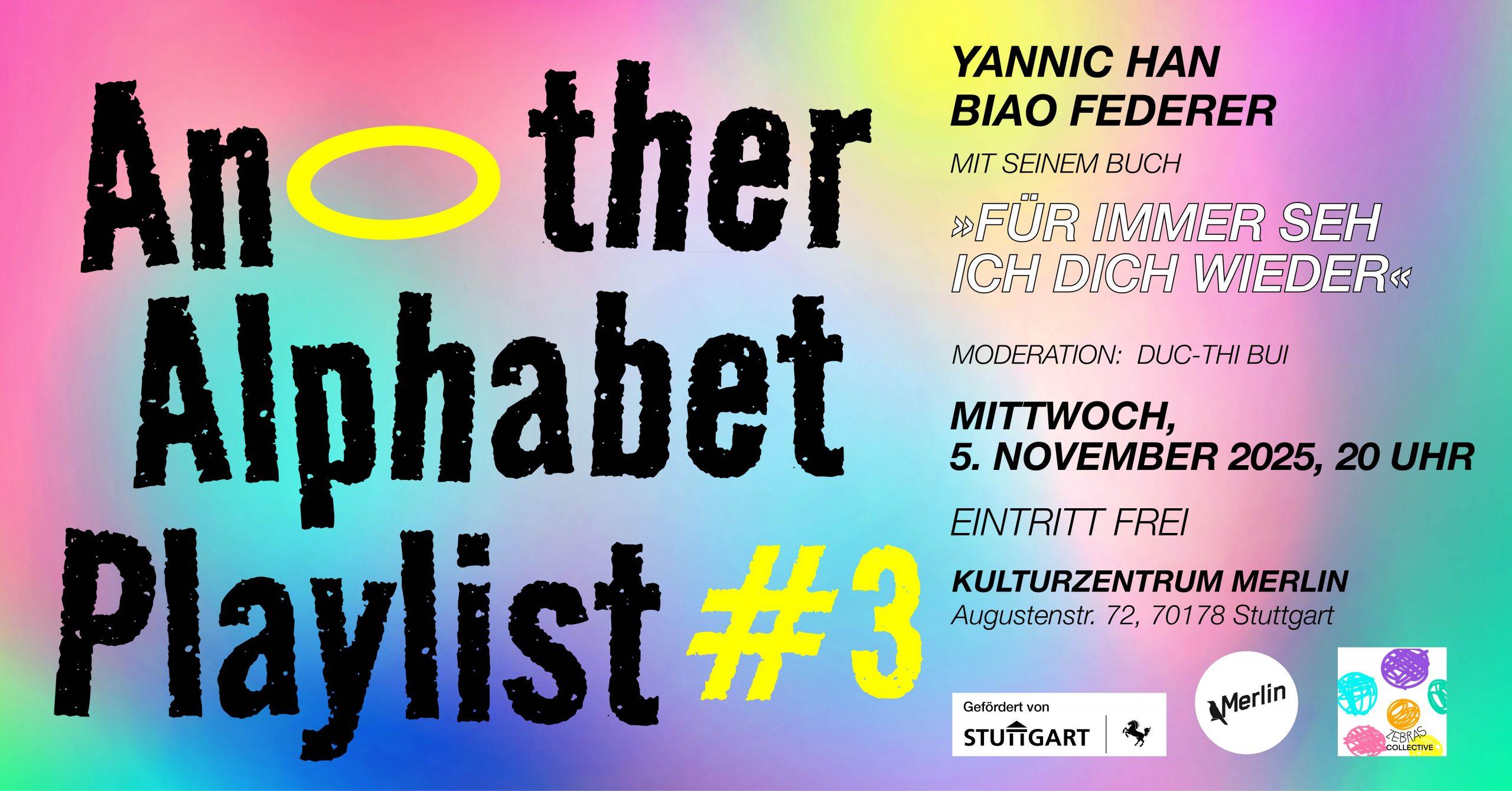 Die Lesung und das Listening werden mit einem moderierten Talk begleitet. Bei unserem dritten »Another Alphabet Playlist« Abend werden wir Yannic Han Biao Federer als Gast haben, der uns sein Buch »Für immer seh ich dich wieder« und seinen persönlichen Lieblingssong präsentieren wird.