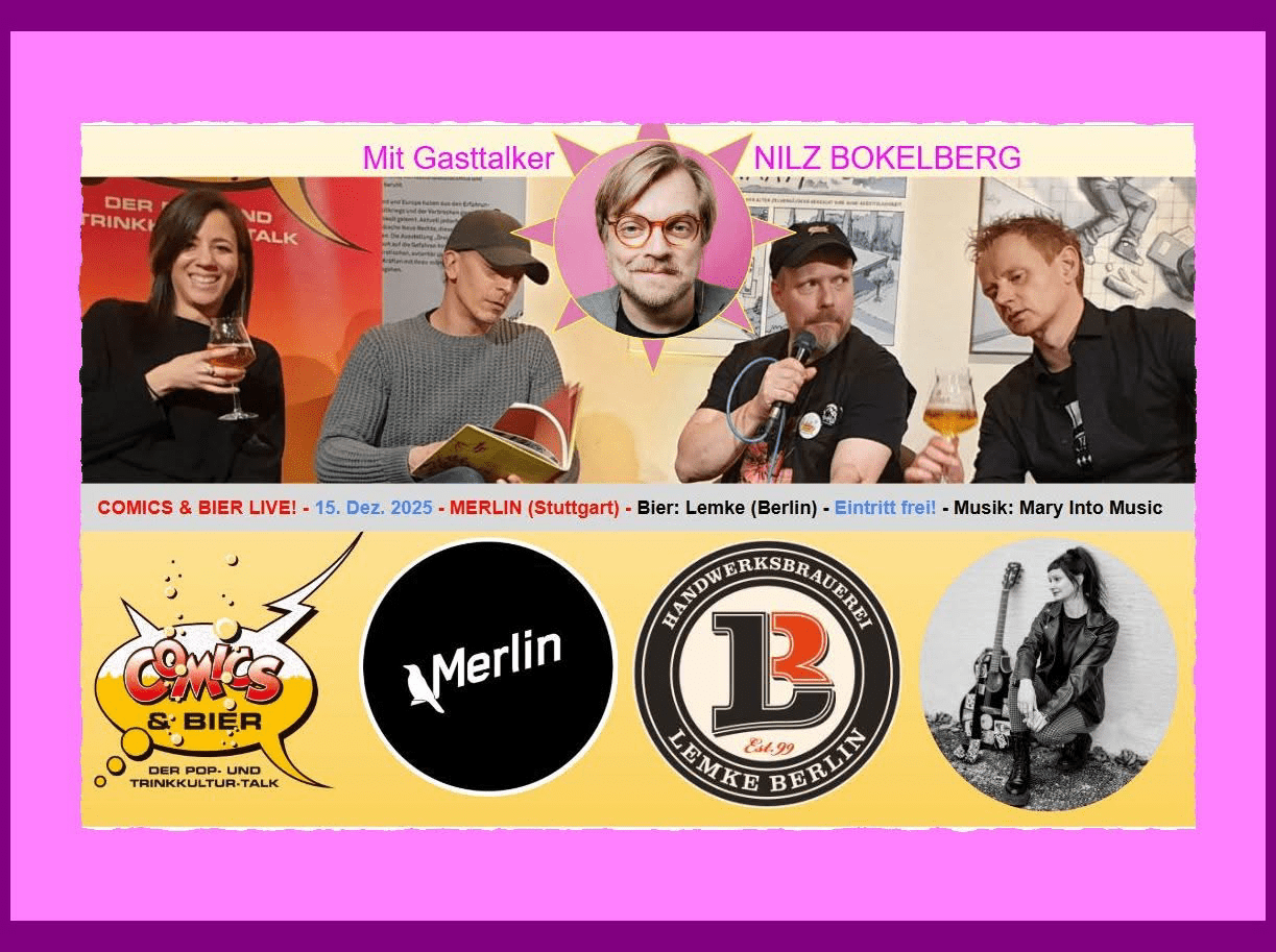 Vier gleichermaßen redselige wie trinkfeste Nerds treffen sich, um – moderiert von Comic-Redakteur und Biersommelier Steffen Volkmer – über Comics und Bier zu reden. Das ergibt durchaus Sinn und braucht kaum weitere Erklärungen. Das Ganze wird – das wissen wir aus den vergangenen Shows – sehr unterhaltsam, bisweilen schräg und garantiert geistreich!