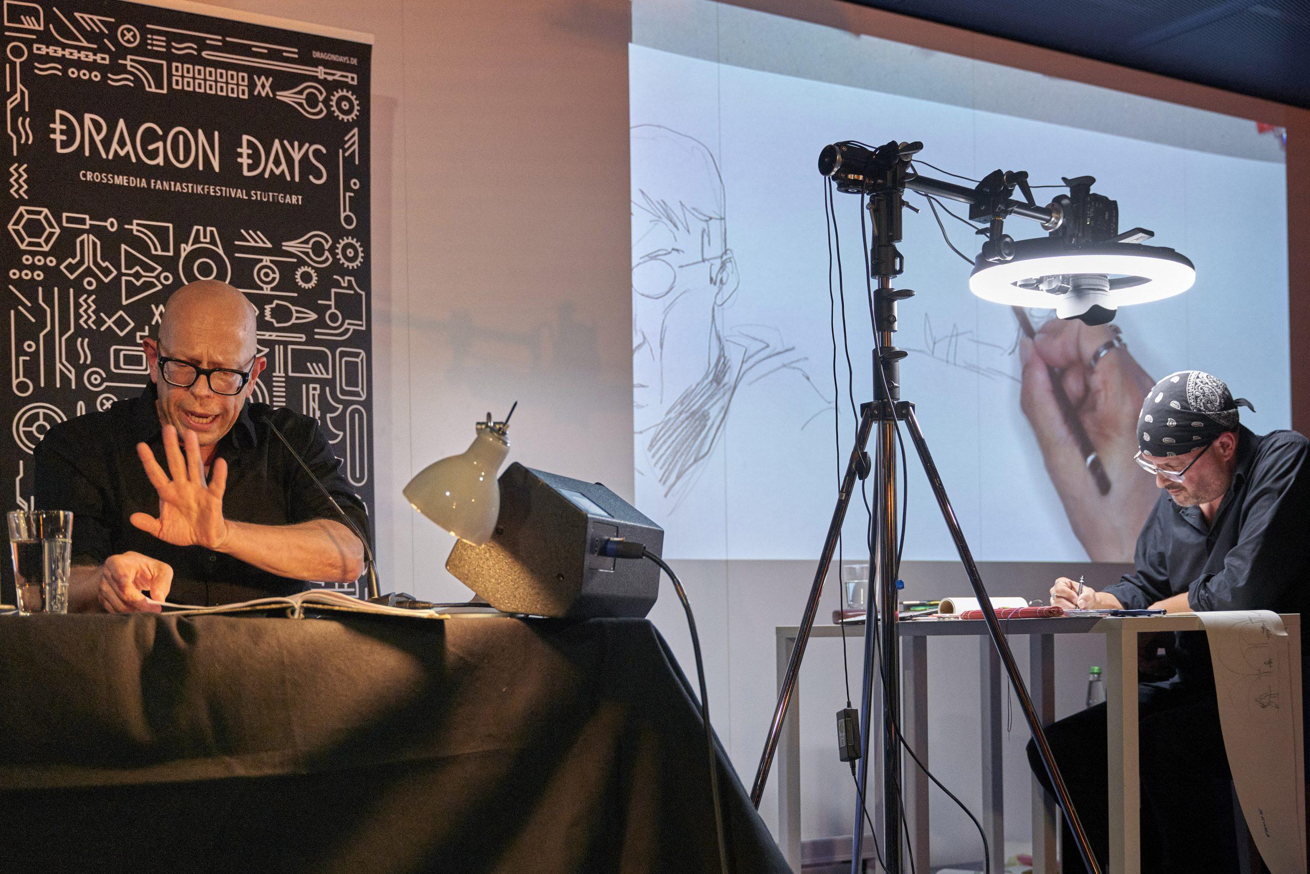 Wieder einmal liefert der Literaturservice Dinter, Schneyder, Koch und Kysela beim Stuttgarter Fantastik-Festival Dragon Days ein Sprechtakel der besonderen Art – erleben Sie, wie live gemalte Szenen auf der Leinwand mit der Geschichte und der Musik verschmelzen!